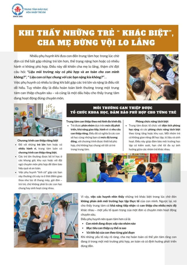 Trung tâm Giáo dục Hòa nhập Trẻ Em luôn nỗ lực phấn đấu là trung tâm hàng đầu trong việc giáo dục trẻ chậm nói, trẻ tự kỷ, trẻ tăng động, giảm chú ý, trẻ rối loạn cảm xúc, trẻ ngọng, khó khăn trong học tập, trẻ chậm phát triển trí tuệ bằng chất lượng giáo dục, tâm huyết, tình yêu thương trẻ cùng với sự kết hợp các tiến bộ trên thế giới về can thiệp và giáo dục, hỗ trợ cho trẻ có nhu cầu đặc biệt.