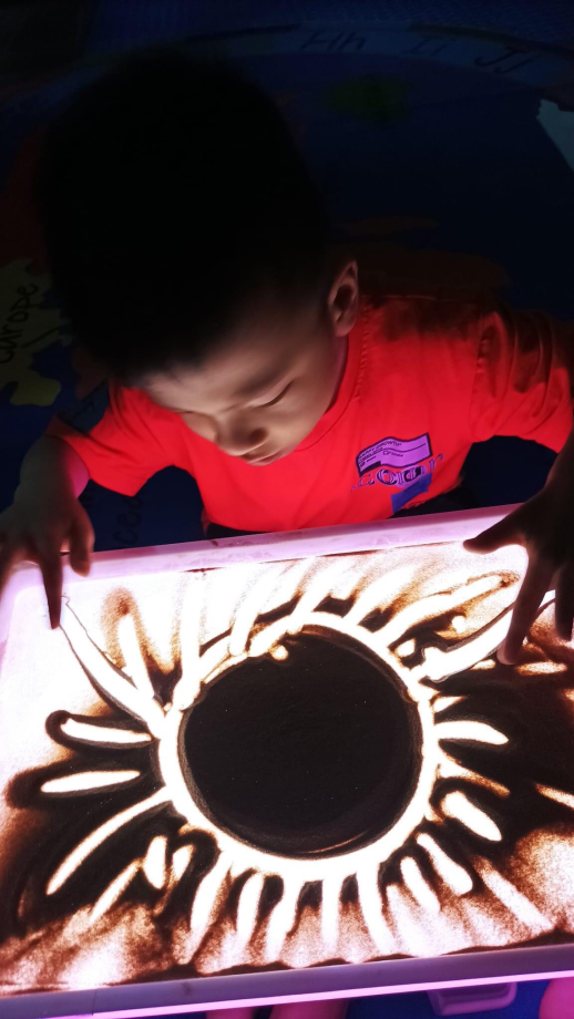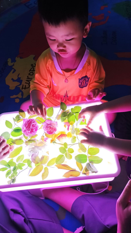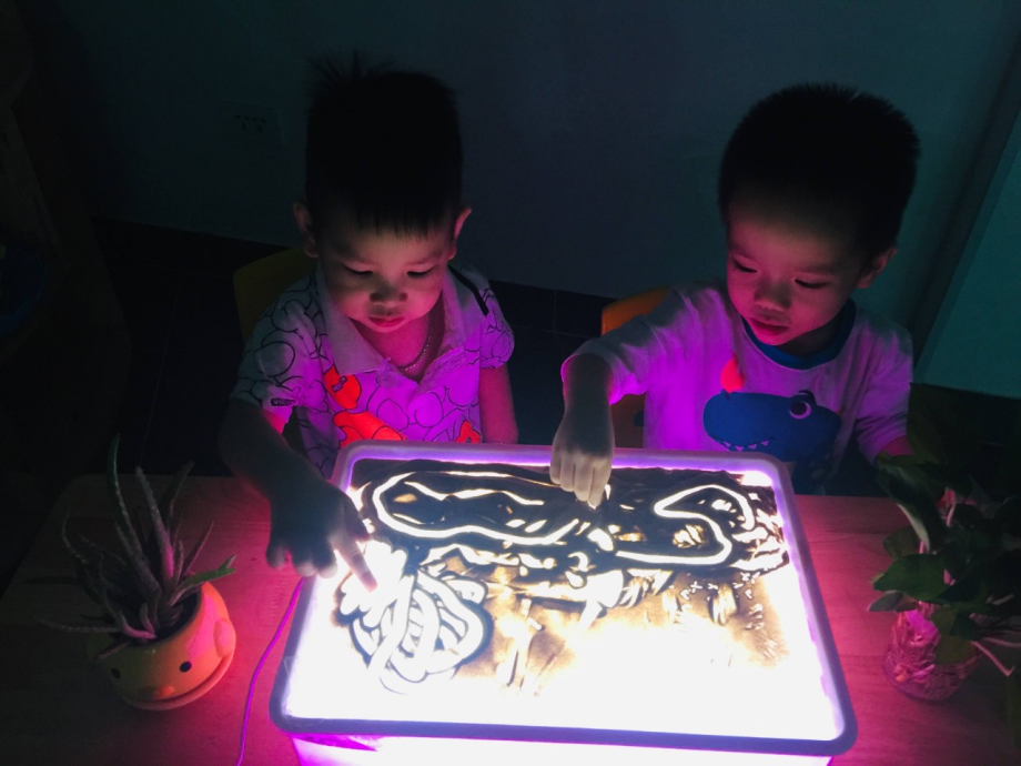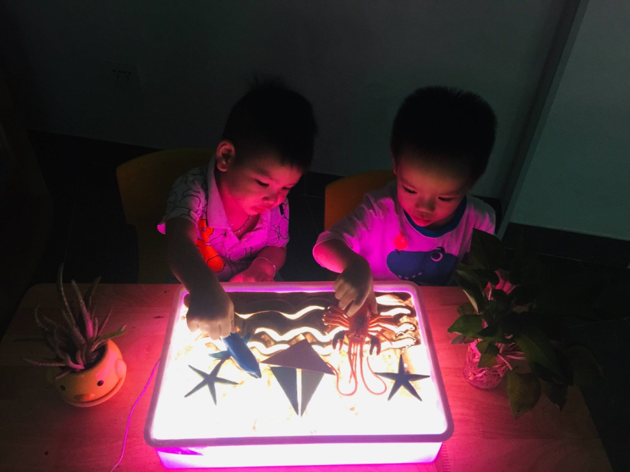 Chơi tự do với bàn ánh sáng cũng giúp phát triển trí tưởng tượng mà đây là nền tảng cho sự sáng tạo. Mặt khác khi ánh sáng ngập tràn từ phía dưới bàn chiếu lên mọi sự vật sẽ trở nên sinh động, tác động trực tiếp vào thị giác và kích thích sự tìm hiểu của trẻ. Các con đã đã có những giờ trải nghiệm và bạn nào cũng miệt mài bên bàn ánh sáng mà không biết chán, mọi vật trong tay các con đều được thắp sáng và trí tưởng tượng của con sẽ bay xa với một thế giới lung linh ánh sáng!