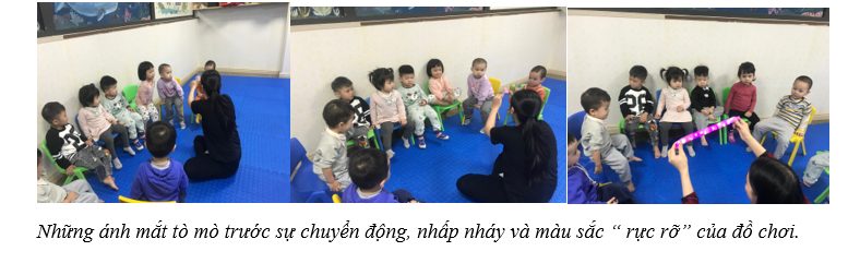 Trẻ sẽ bị thu hút bởi điều gì nhất? Đó chính là sự chuyển động hoặc cái gì đó có màu sắc sặc sỡ…Nắm bắt được điều đó giáo viên khi dạy nhóm đã thiết kế những hoạt động nhìn thì “có vẻ đơn giản” nhưng lại thực sự hiệu quả trong việc thu hút trẻ. Đó có thể là những hoạt động như: