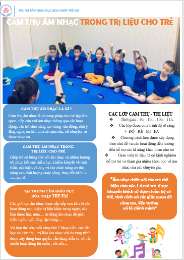 - Giáo viên trị liệu đã có kinh nghiệm hỗ trợ trẻ và tham gia nhiều khóa học về âm nhạc của các chuyên gia.