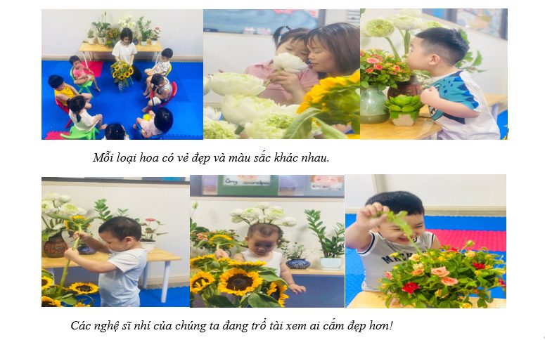 - Trẻ được thực hành kỹ năng “ cắm hoa” nghệ thuật nữa nhé. Điều này không chỉ giúp trẻ phát triển khả năng quan sát mà cả sự khéo léo của đôi bàn tay. Có những bạn thực hiện còn vụng về nhưng có những bạn lại rất khéo léo và tỏ ra “ say mê” trong sự sáng tạo của mình. Hoạt động này cũng giúp trẻ phát triển tính thẩm mỹ và sự trân trọng, yêu quý cái đẹp hơn.