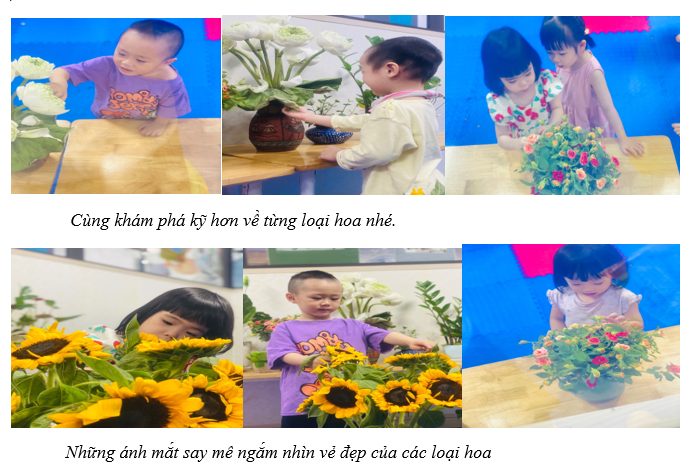 - Trẻ được nhận biết tên các loại hoa trong mùa hè như: hoa hồng; hoa hướng dương; và đặc biệt là hoa sen- một loại hoa sẽ nở đẹp nhất trong mùa hè của miền Bắc. Ngoài quan sát qua tranh thì hôm nay các con được nhìn thấy những bông hoa “ thực sự” với màu sắc và hương thơm tuyệt vời. Điều này giúp trẻ tăng cường khả năng khái quát hoá- một kỹ năng mà nhiều trẻ còn gặp khó khăn. Ngoài tên các loại hoa thì trẻ còn được nhận biết cả về màu sắc và một số bộ phận khác như: lá; cành; nhuỵ hoa…( cô giới thiệu thêm).
