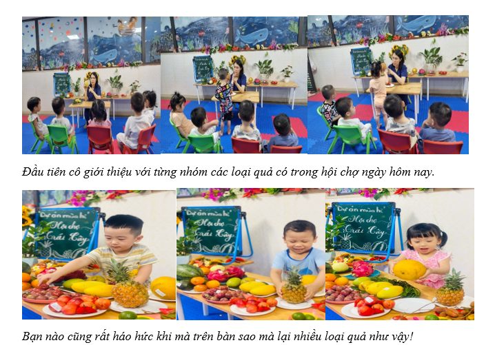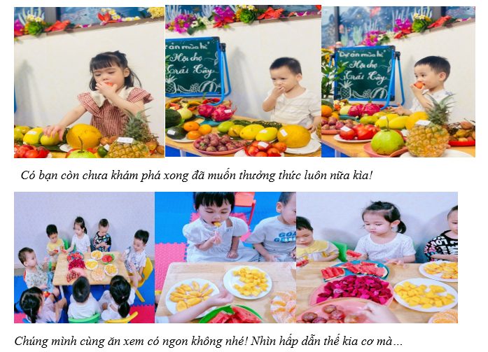 Mùa hè sẽ có một số loại trái cây đặc trưng như: vải; xoài; mận; đào; hồng; dứa…ngoài ra còn một số loại trái cây khác như: bưởi, chanh; thanh long; ổi; dưa hấu…Thật đúng như tên gọi của nó “hội chợ” chính là sự đa dạng và phong phú của các loại trái cây mà trẻ được trải nghiệm thực tế ngay tại lớp học mà không cần phải đi đâu xa để học.