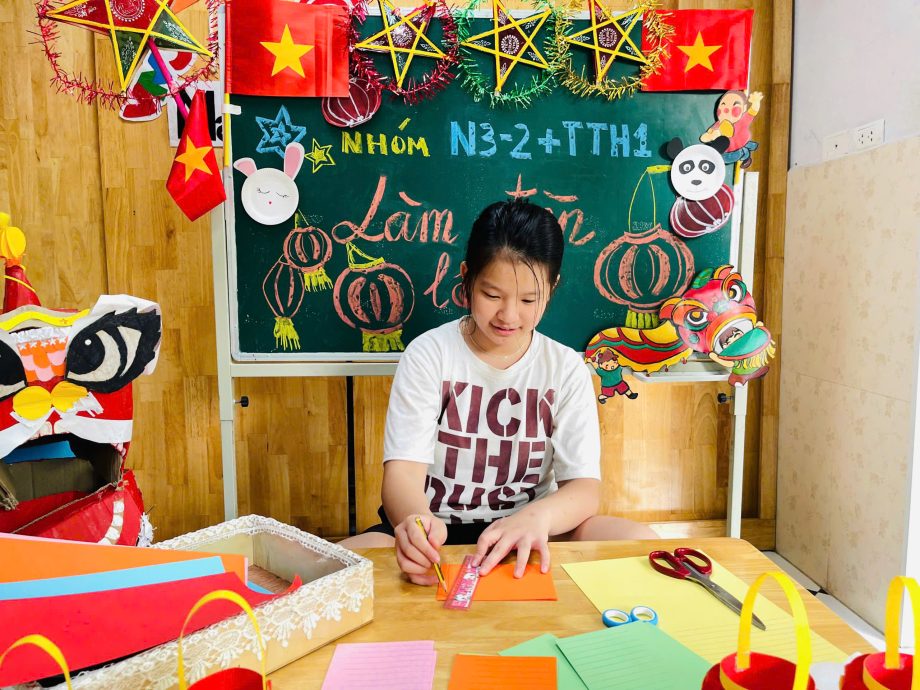 Trong quá trình thực hiện, giáo viên sẽ sử dụng các từ vựng liên quan đến chủ đề như “đèn lồng”, “màu đỏ”, “ngôi sao”, “cờ Việt Nam”, v.v..