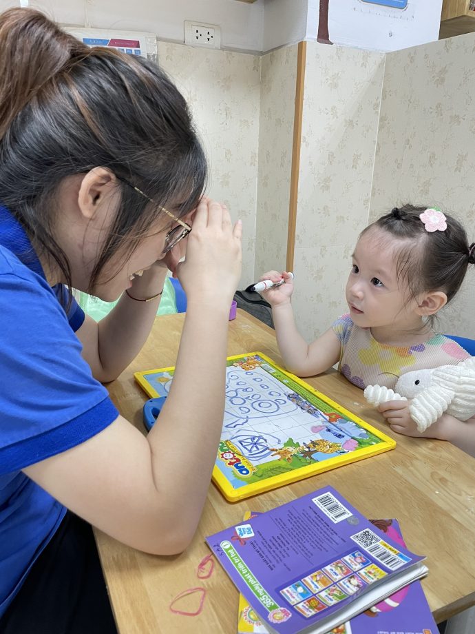 Khi con yêu thích một món đồ nào đó, bố mẹ có thể dạy trẻ giao tiếp, tương tác bằng mắt bằng cách cầm món đồ, di chuyển qua lại hai bên trong tầm mắt của bé. Hoặc đơn giản, bố mẹ cũng có thể sử dụng ngón tay di chuyển qua lại tương tự khi sử dụng đồ chơi ở mọi lúc, mọi nơi. Bố mẹ có thể thấy làm cách này giúp trẻ di chuyển ánh mắt để chú ý vào thứ đang di chuyển trước mắt mình.