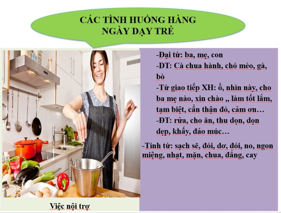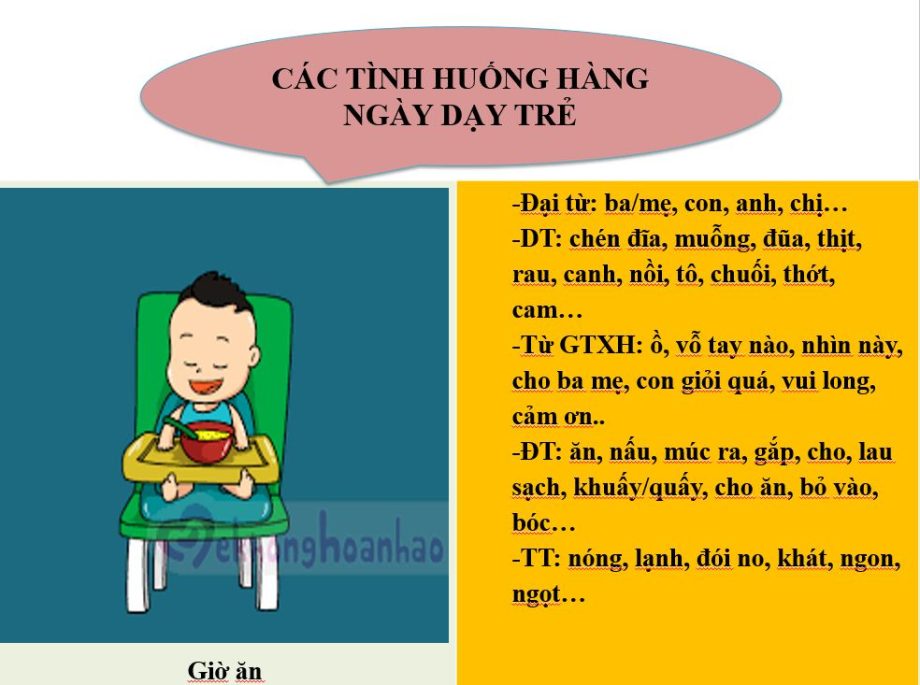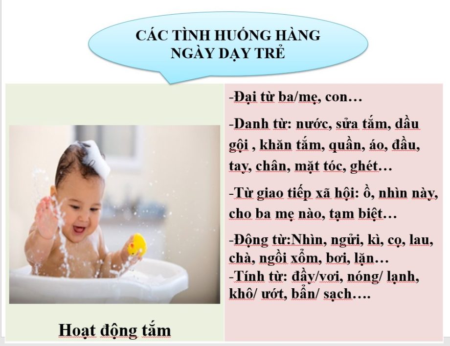 Thông thường bố mẹ hay lo lắng không biết mình dạy con như thế nào và dạy những nội dung gì? Theo nghiên cứu và có nhiều năm kinh nghiệm trong dạy trẻ đặc biệt, các cô thấy việc phát triển ngôn ngữ và giao tiếp cho trẻ thông qua các hoạt động sinh hoạt hàng ngày là thiết thực nhất khi bố mẹ dạy con. Vậy hoạt động sinh hoạt hàng ngày là những hoạt động nào?