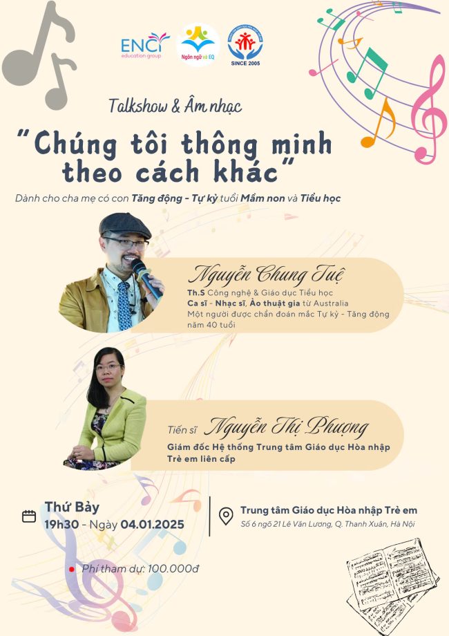 Trẻ tự kỷ- tăng động dạng nhẹ rất khó phát hiện, hiện chưa được thăm khám chuẩn cũng như chưa có hướng can thiệp đúng nên thực tế chưa phát huy được trí thông minh chuyên biệt ở các em cũng như nuôi dưỡng tài năng từ nhỏ. Hãy đến Talkshow & Âm nhạc này để sự khác biệt dẫn dắt những tình yêu và hướng đi nhiều ánh sáng cho các con rối loạn bố mẹ nhé!
