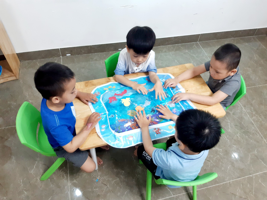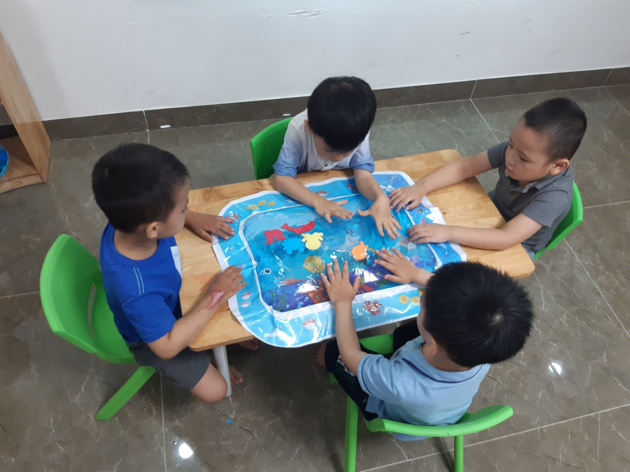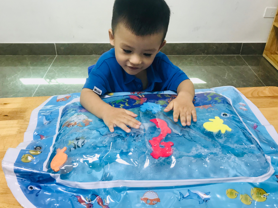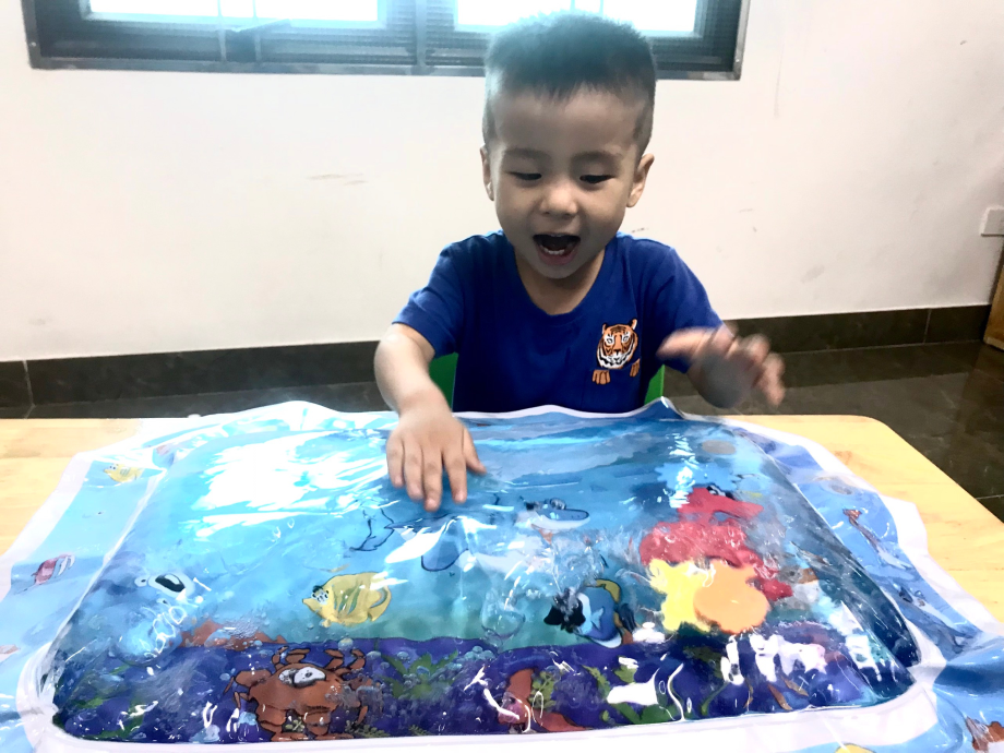 Một trong những món đồ mà các bạn nhỏ ở TTGDHNTE đang rất thích đó chính là “Thảm nước”. Bạn nào cũng thích được nắn, được sờ, vỗ hoặc thậm chí là bóp bóp để cảm nhận sự mềm dẻo chuyển động của nước…