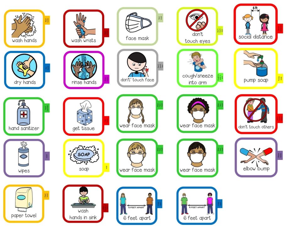 Một trong những khó khăn ở thời điểm này là việc trẻ cảm thấy khó chịu khi phải đeo khẩu trang cả ngày dài, thậm chí có trẻ còn thích cắn và nhai khẩu trang. Khi đó, các cô thường sử dụng thẻ hành vi, dán ở cửa phòng, các thẻ thường xuyên sử dụng như: Đeo khẩu trang, không chạm tay vào mắt, không cắn khẩu trang… sẽ được dán ở các vị trí trong phòng. Cha mẹ có thể tham khảo và áp dụng với con khi cho con ra ngoài.