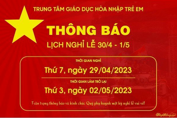 Nhân dịp kỷ niệm các ngày lễ lớn nhất đất nước, Trung tâm Giáo Dục Hòa Nhập Trẻ Em xin gửi tới Quý phụ huynh những lời chúc mừng và tri ân sâu sắc. Cảm ơn Quý phụ huynh đã luôn tin tưởng và đồng hành cùng Trung tâm trên chặng đường can thiệp cho các con .